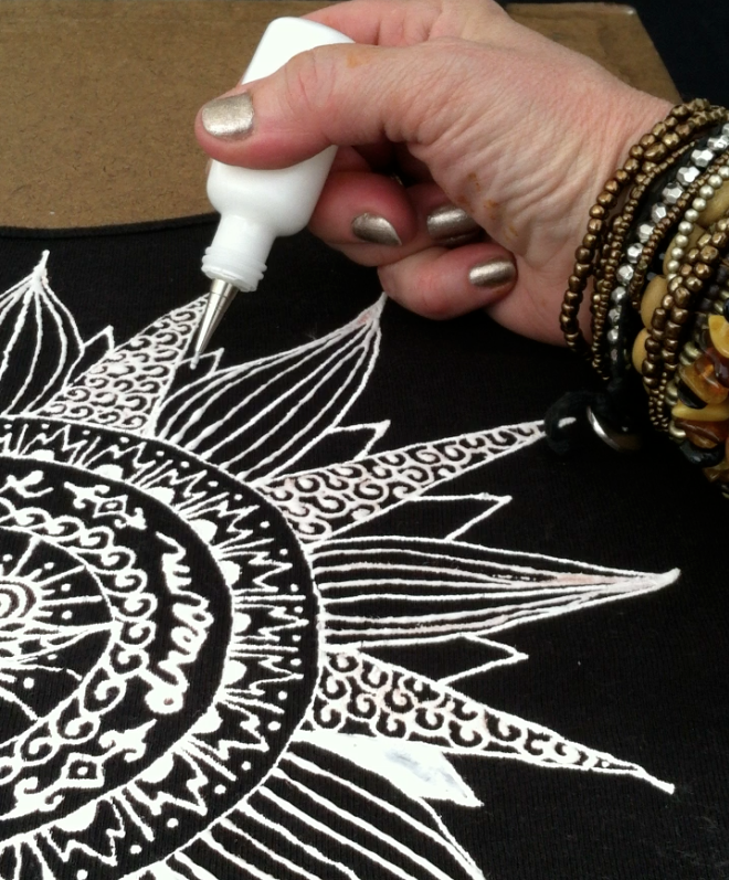 Another popular workshop has been bleach painting on t-shirts and tank tops. This workshop grew out of my own experimentation with bleach painting henna designs, inspired by my sister-in-law and my daughter’s forays into henna art.