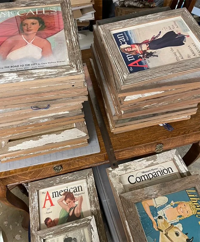 Aside from creating in my studio, there are few things I enjoy more than browsing for antiques. Our Victorian farmhouse is the perfect setting to display my “finds” so I tend to indulge this passion! I look for vintage women’s magazines from the late 1800’s to the 1960’s with colorful advertisements, old books with well-loved covers and beautiful illustrations, print blocks used in early printmaking, vintage handbags & jewelry; in general, personal items owned by women and girls from the past whose stories I imagine simply based on their well-worn, well-loved treasures.
